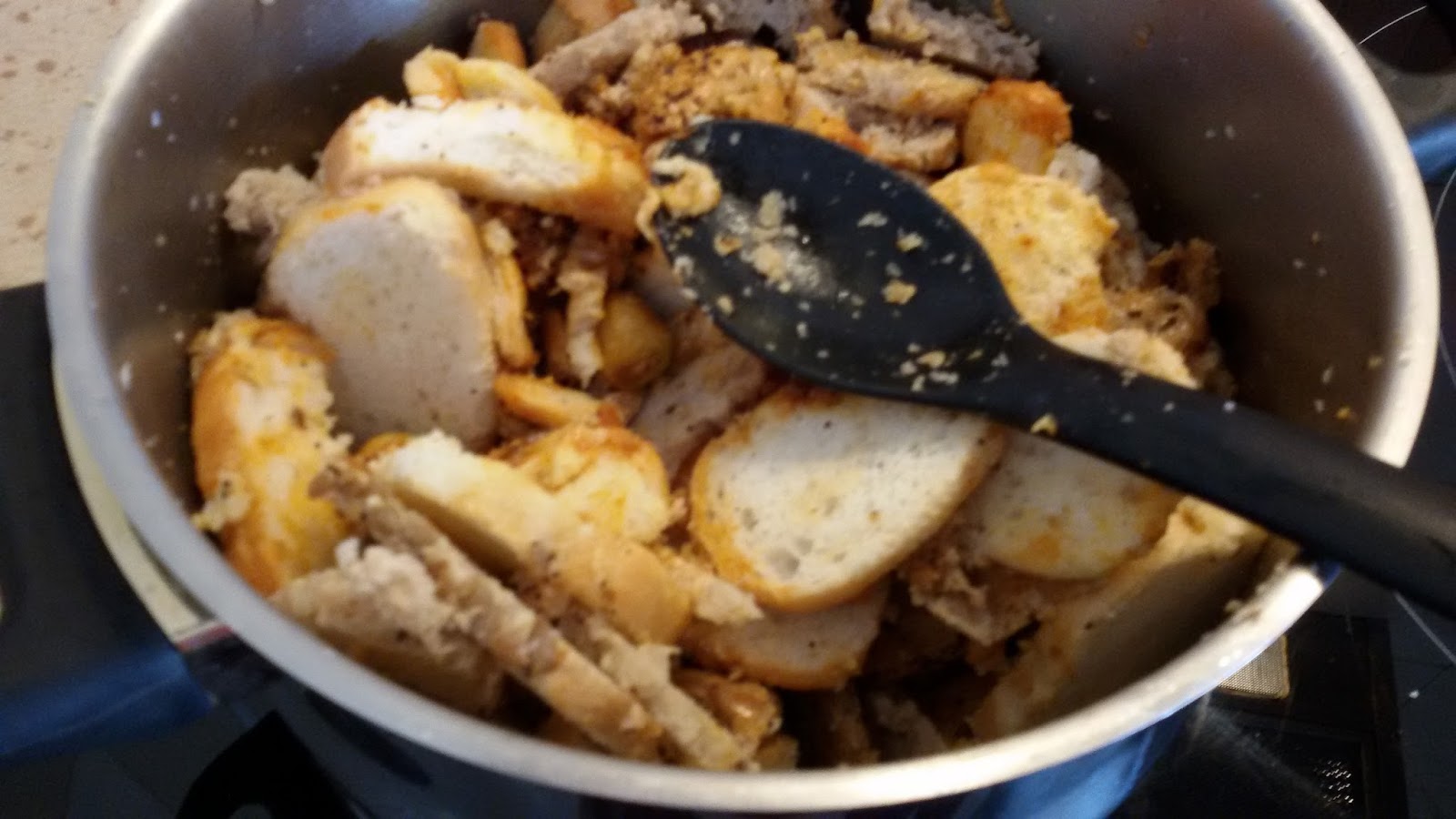 5. Es la hora de agregar nuestro pan humedecido y lo mezclamos para que vaya aromatizándose con el ajo, chorizo y pimentón.